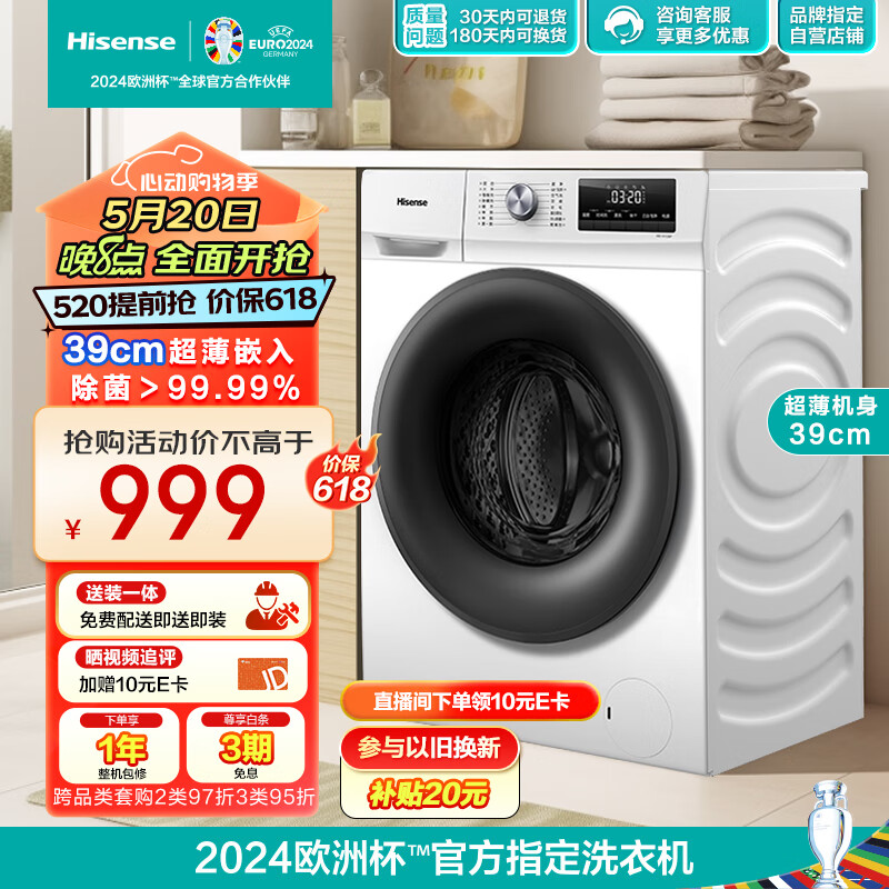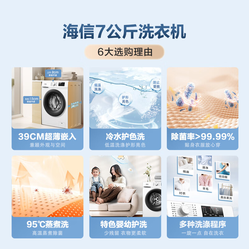 海信(Hisense)滚筒洗衣机全自动 7公斤超薄嵌入 小型家用 除菌洗 冷水护色洗 HG70DA10 以旧换新价格:999.00元!