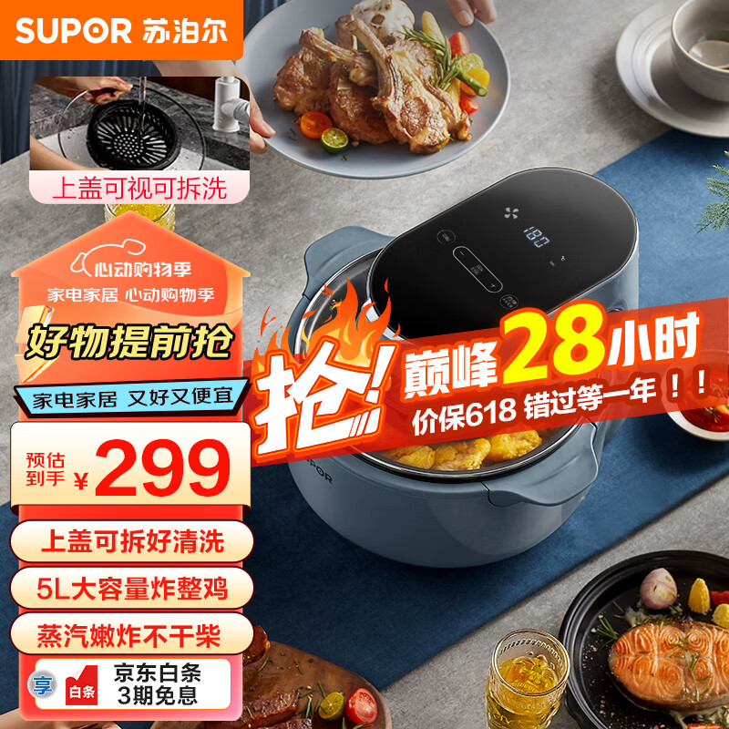 苏泊尔(SUPOR)空气炸锅 不用翻面 家用多功能 智能控温 全景可视 蒸汽嫩炸 无油煎炸 烤箱薯条机KD50DQ852价格:299.00元!