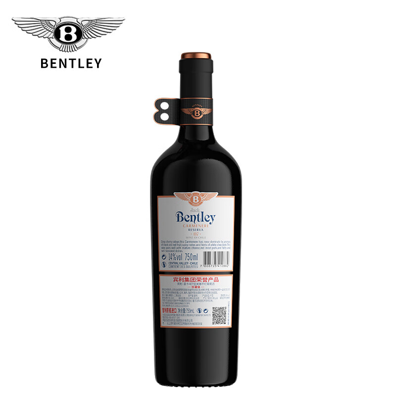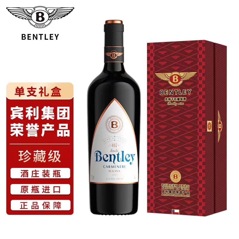 宾利(BENTLEY)智利原瓶进口红酒干红葡萄酒爵卡407珍藏级送礼自饮红酒礼盒单支价格:158.00元!