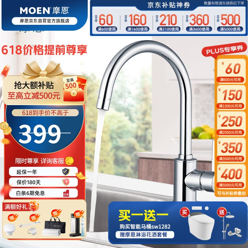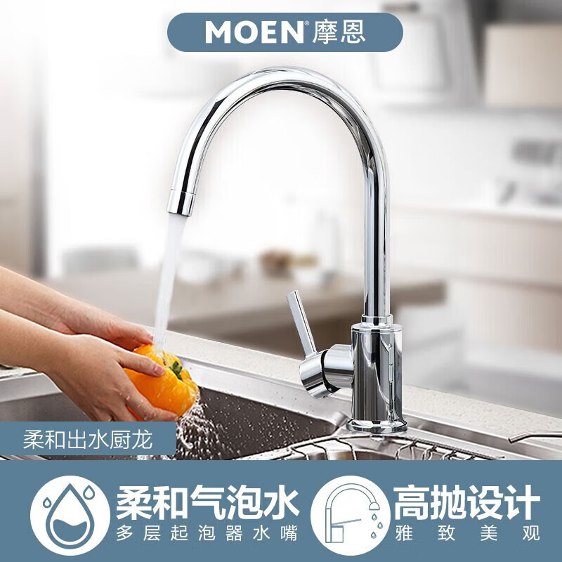 摩恩(MOEN)厨房冷热水龙头 净铅高抛龙头 水槽洗菜盆洗碗盆防飞溅水龙头价格:449.01元!