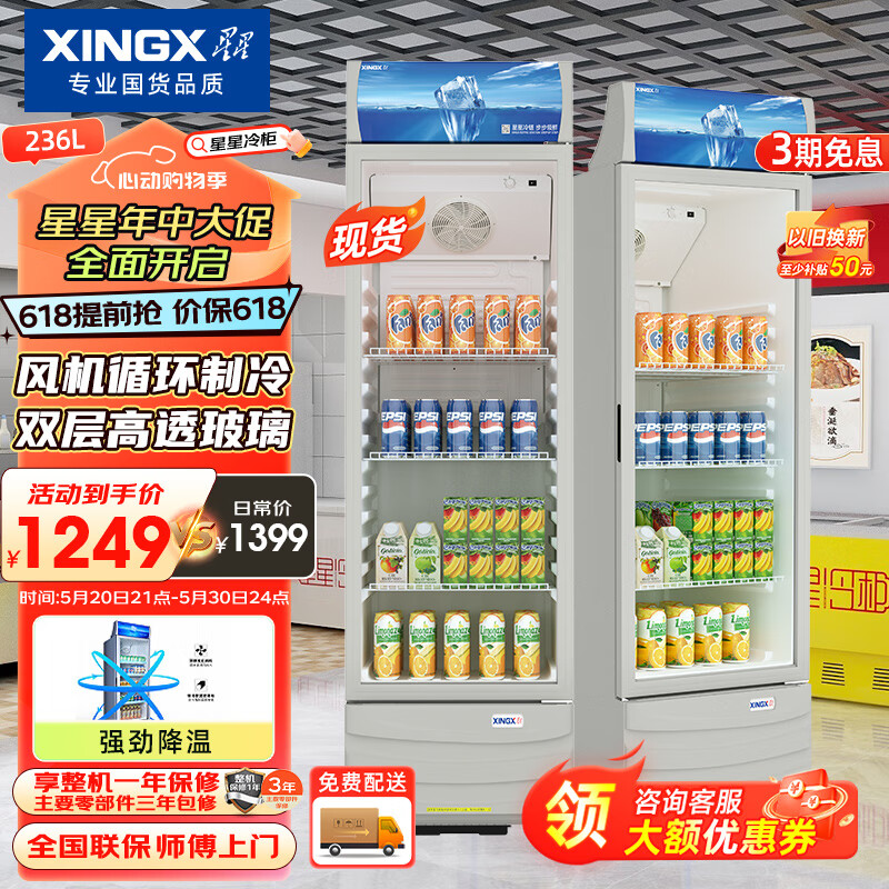 星星(XINGX) 236升 立式玻璃门冷柜 饮料陈列柜 商用冷藏冰箱(银灰色) LSC-236C价格:1249.00元!