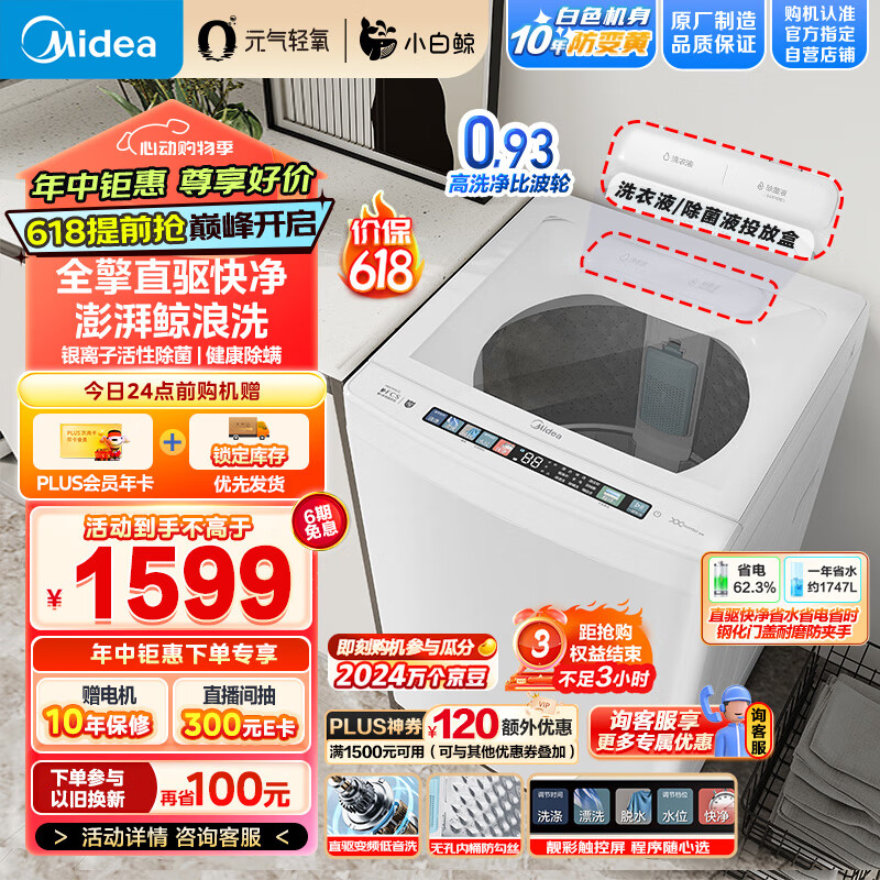 美的(Midea)波轮洗衣机全自动 元气轻氧系列 小白鲸 MB100WJ3 全擎直驱快净 防变黄科技 无孔内桶 10公斤价格:1599.00元!