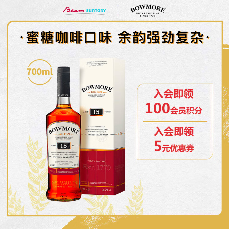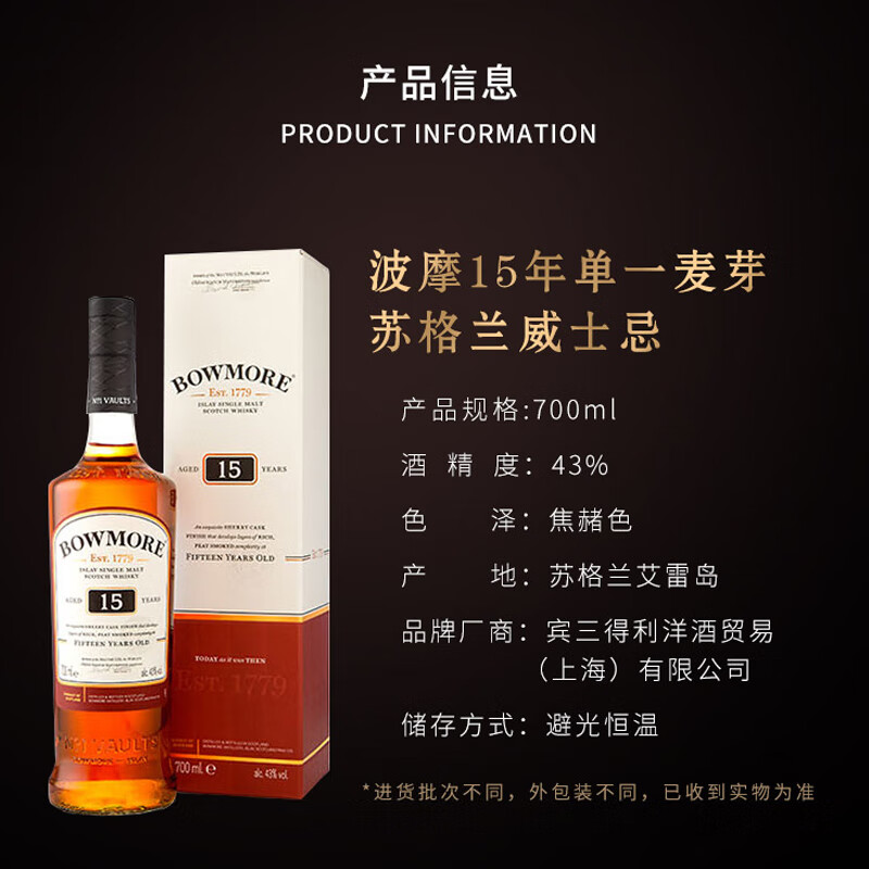 波摩(Bowmore)15年 苏格兰 艾雷岛 单一麦芽 威士忌 洋酒 700ml 礼盒价格:418.00元!