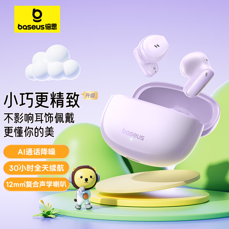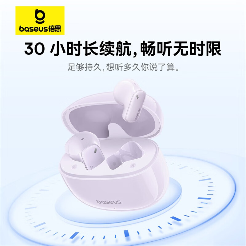 倍思 E10 真无线蓝牙耳机 30小时长续航 半入耳舒适佩戴 蓝牙5.3音乐游戏耳机适用苹果华为小米手机 紫价格:119.00元!