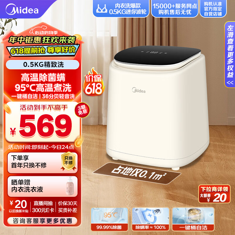 美的(Midea)0.5kg迷你洗衣机 内衣裤洗衣机小型 迷你洗衣机 高温除菌螨 轻音洗 MNB5VCAW0E价格:566.00元!