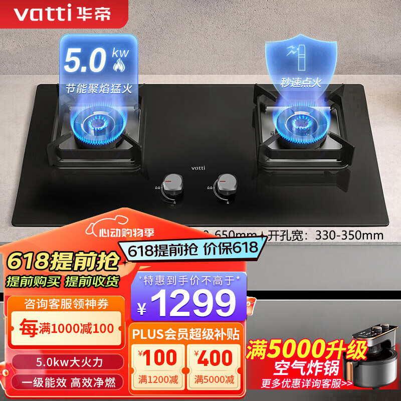 华帝(VATTI)i10073B燃气灶官方嵌入式台式双灶具5.0kw猛火灶台多档火力精控一级能效易清洁 燃气灶 天然气价格:1399.00元!