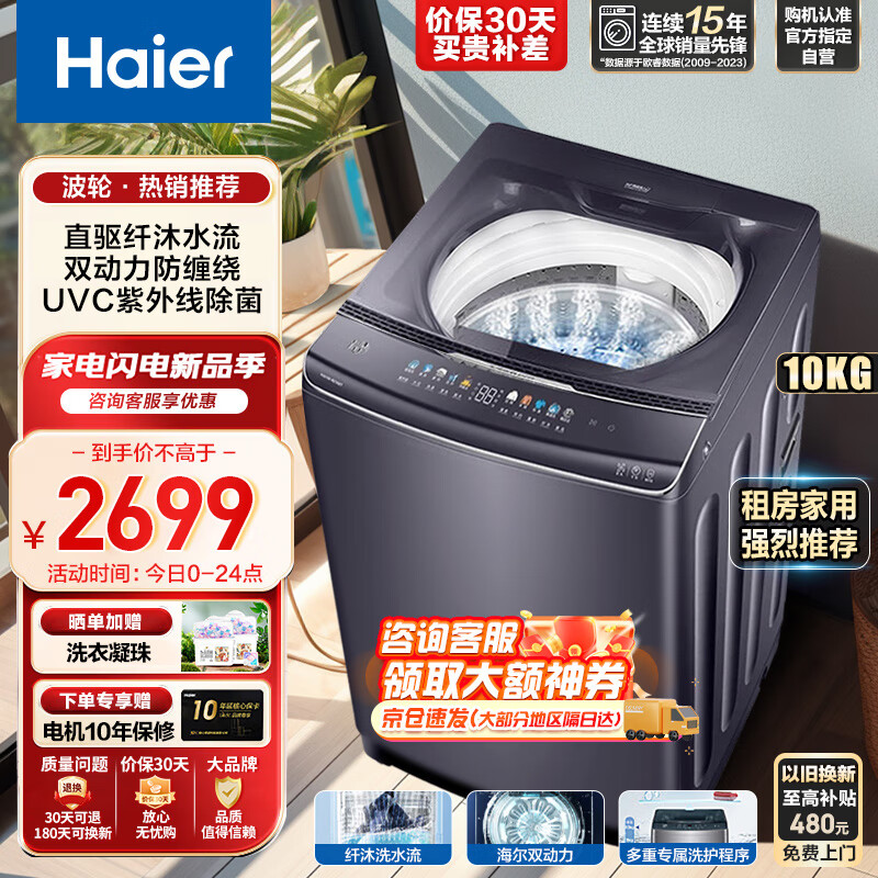 海尔(Haier)波轮洗衣机10公斤大容量新风双动力防缠绕 直驱变频全自动羽绒洗 以旧换新价格:2699.00元!