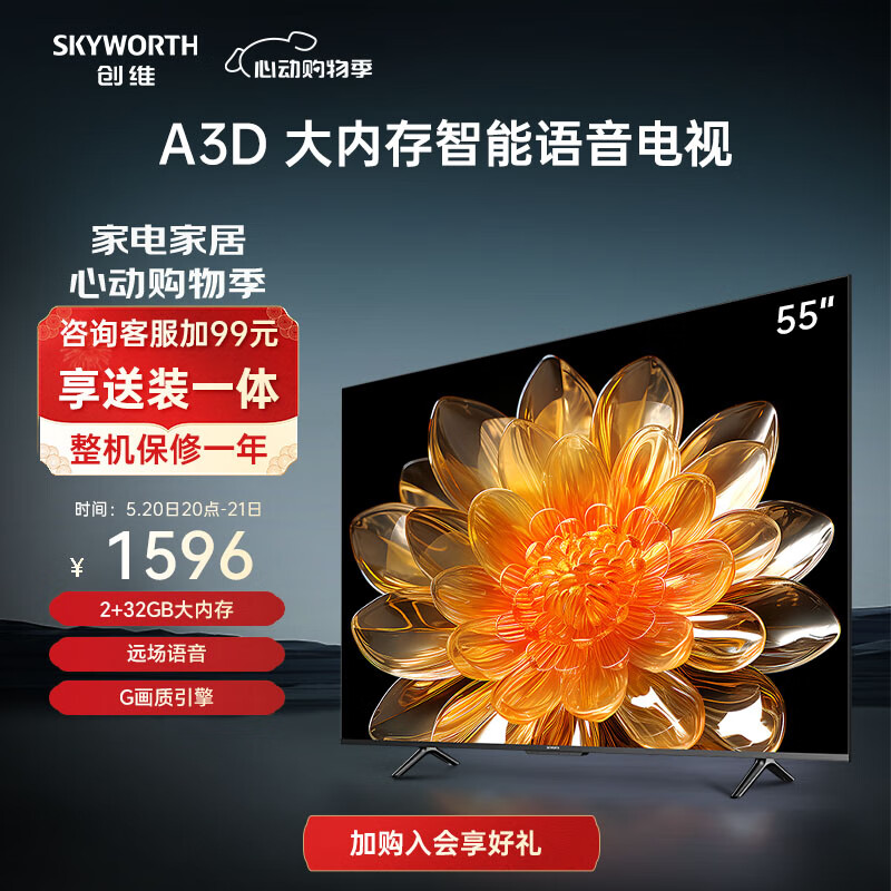 创维电视55A3D 55英寸电视机2+32G远场语音G画质引擎智能投屏4K超高清护眼屏价格:1596.00元!