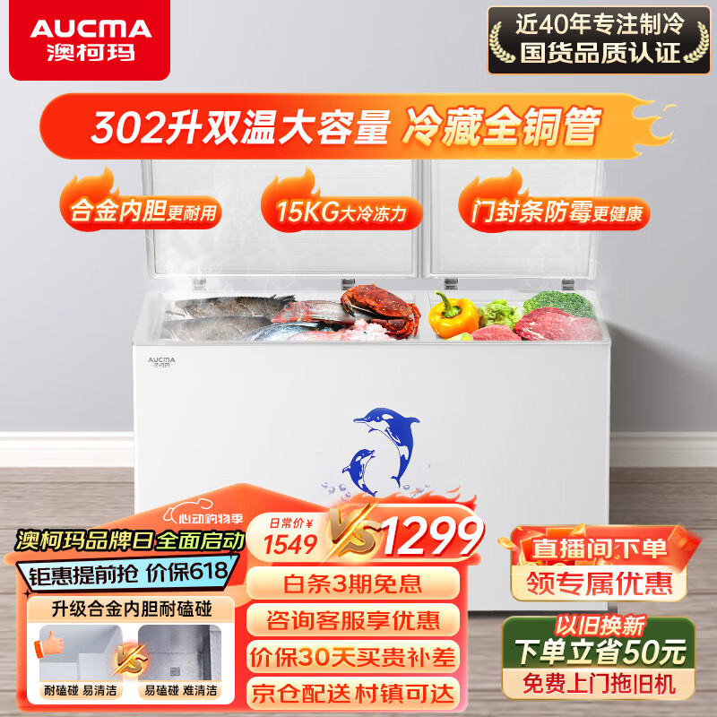 澳柯玛(AUCMA)302升 冰柜家用双温双箱商用家用大容量冰柜卧式冰柜囤货冷柜冷藏全铜管BCD-302CNE以旧换新价格:1439.00元!