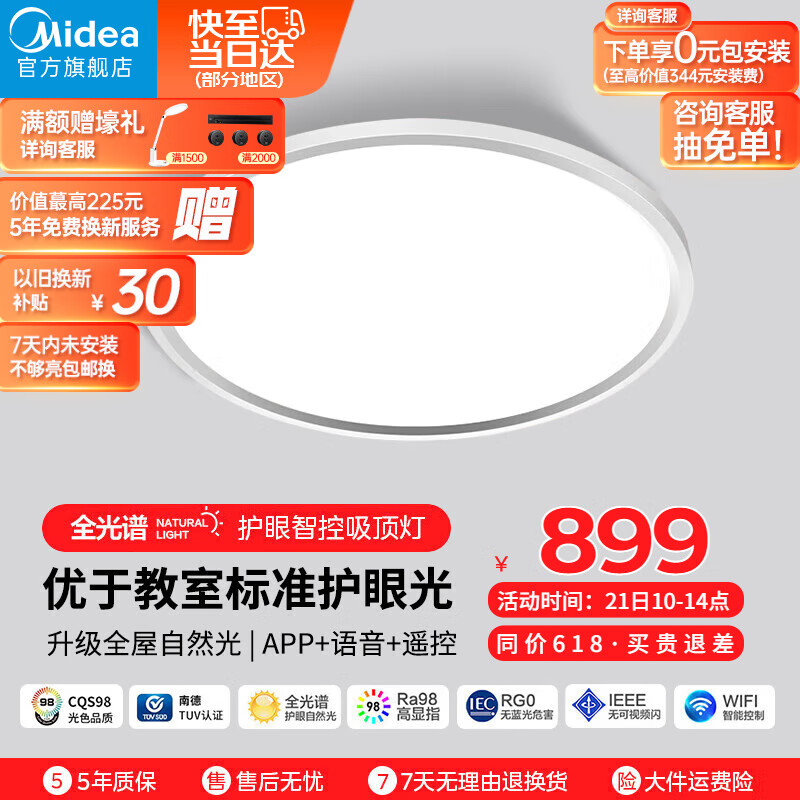 美的(Midea)LED护眼防蓝光客厅灯吸顶灯卧室儿童房灯具全光谱学习智控圆灯价格:899.00元!