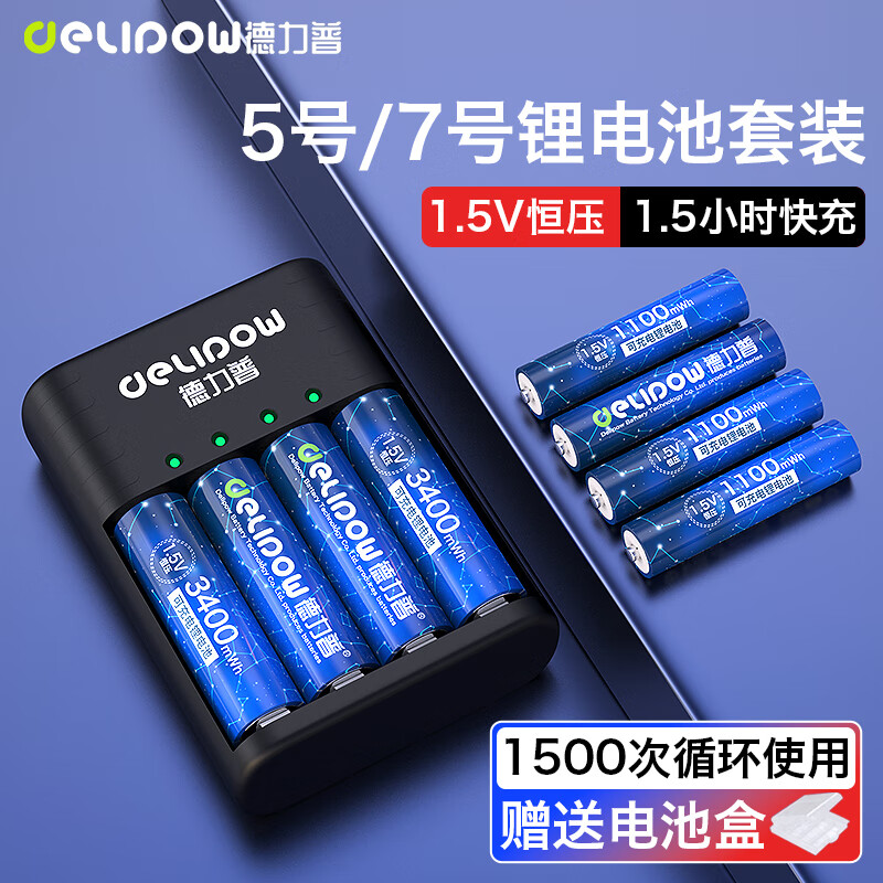 德力普(Delipow)充电电池 5号/7号锂电池3400mWh大容量1.5V恒压8节装配4槽智能快充充电器适用玩具/游戏手柄/话筒价格:186.80元!