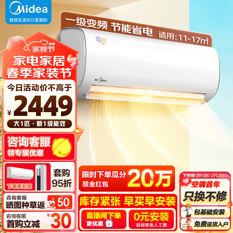 美的(Midea)空调大1匹挂机 冷静星二代 新一级能效 变频冷暖 壁挂式 KFR-26GW/BDN8Y-PH200(1)A 卧室书房空调价格:2449.00元!