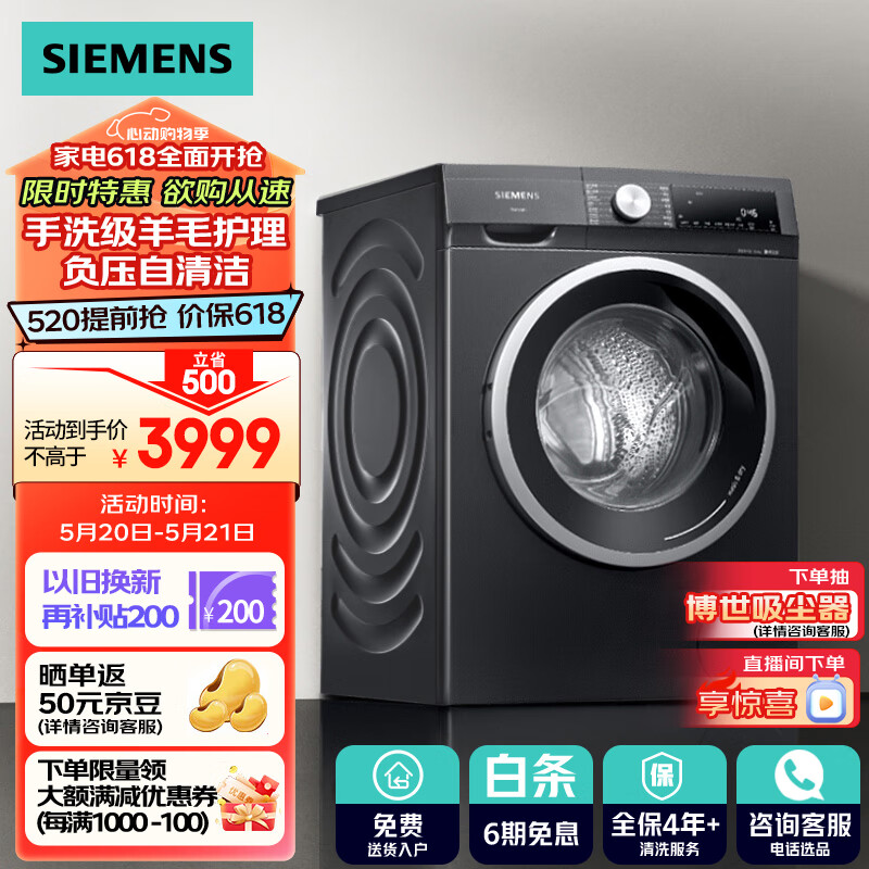 西门子(SIEMENS)iQ300曜石黑系列 10公斤滚筒全自动洗衣机烘干机一体机 专业除菌护衣 618羽绒服洗烘 U24W价格:4499.00元!
