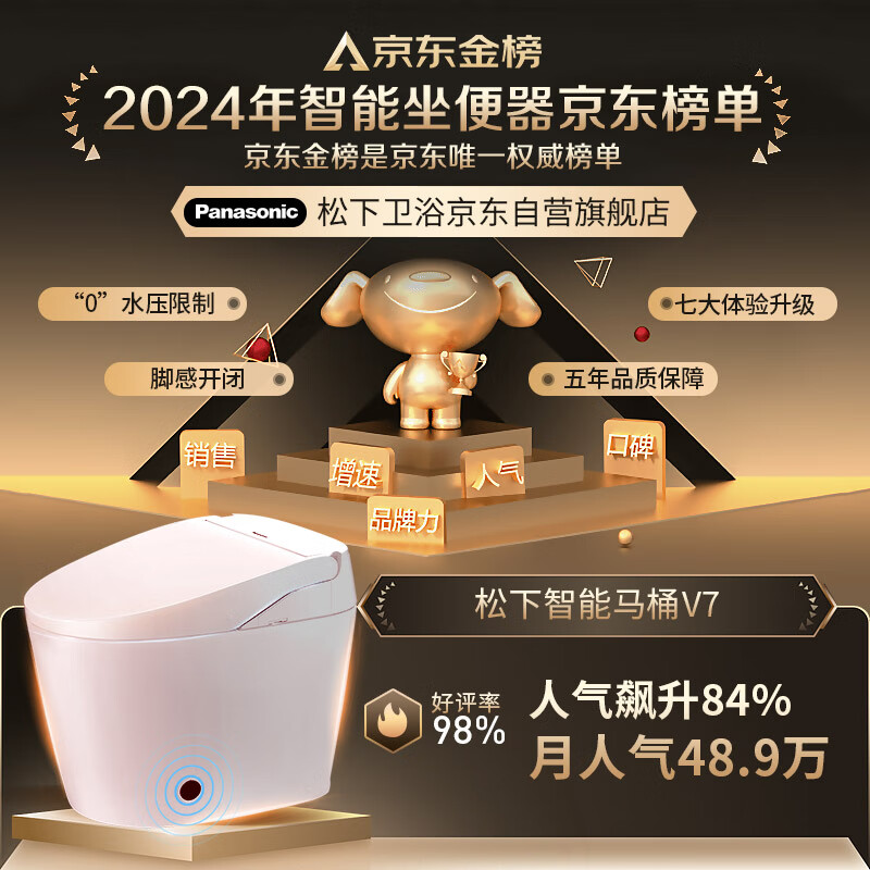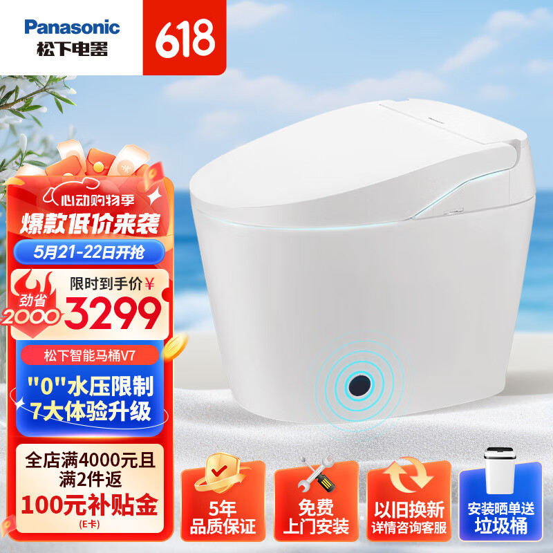 松下(Panasonic)即热式智能马桶坐便器家用V7 低水压脚踢翻圈 分体式CHGJ724WC价格:5699.00元!