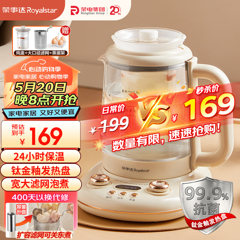 荣事达(Royalstar)养生壶办公室多功能煮茶壶烧水壶1.5L玻璃恒温壶花茶壶电水壶煮水壶煮茶器加大滤网YSH1585D价格:169.00元!