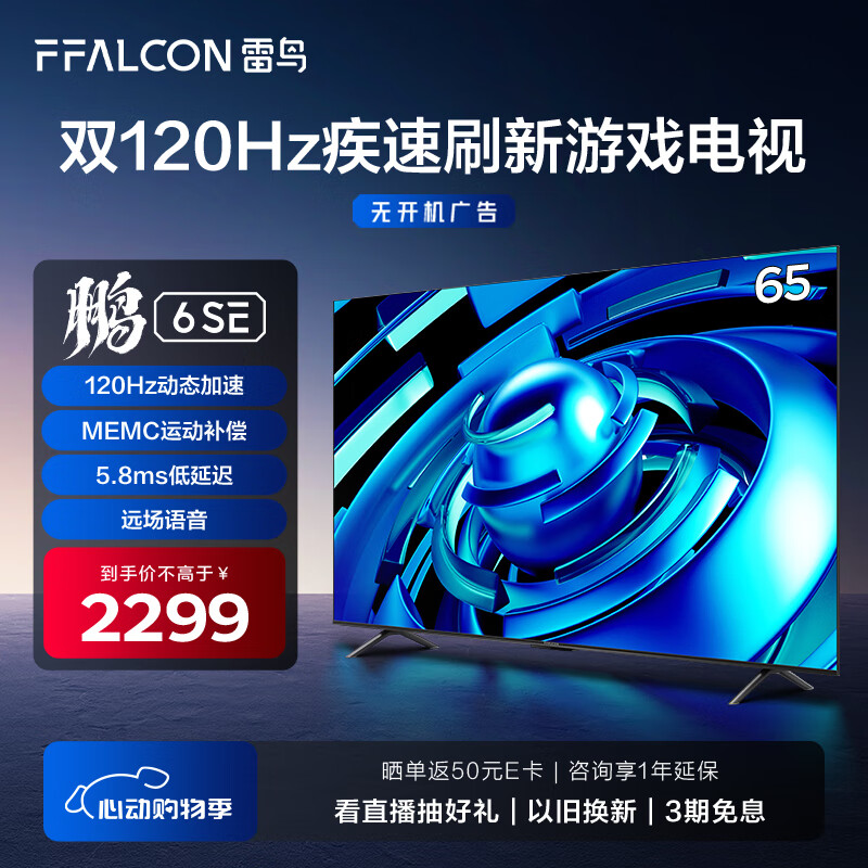 FFALCON雷鸟 鹏6SE 65英寸游戏电视 4K超薄屏 MEMC防抖 远场语音 2+32G 智能液晶平板电视机65S365C价格:2299.00元!