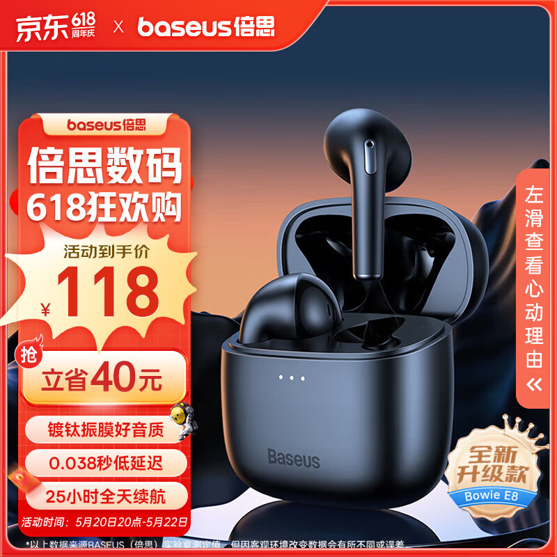 倍思E8 2023版 真无线蓝牙耳机升级游戏音效半入耳式 超长续航 适用苹果华为小米OPPO手机 黑色价格:118.00元!