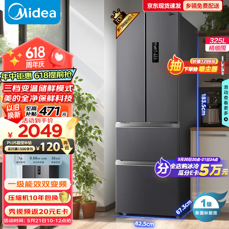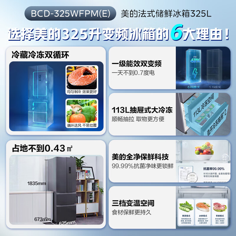 美的(Midea)325升一级能效双变频法式多门四开门小型家用电冰箱超薄风冷无霜节能低噪BCD-325WFPM(E)价格:2249.00元!