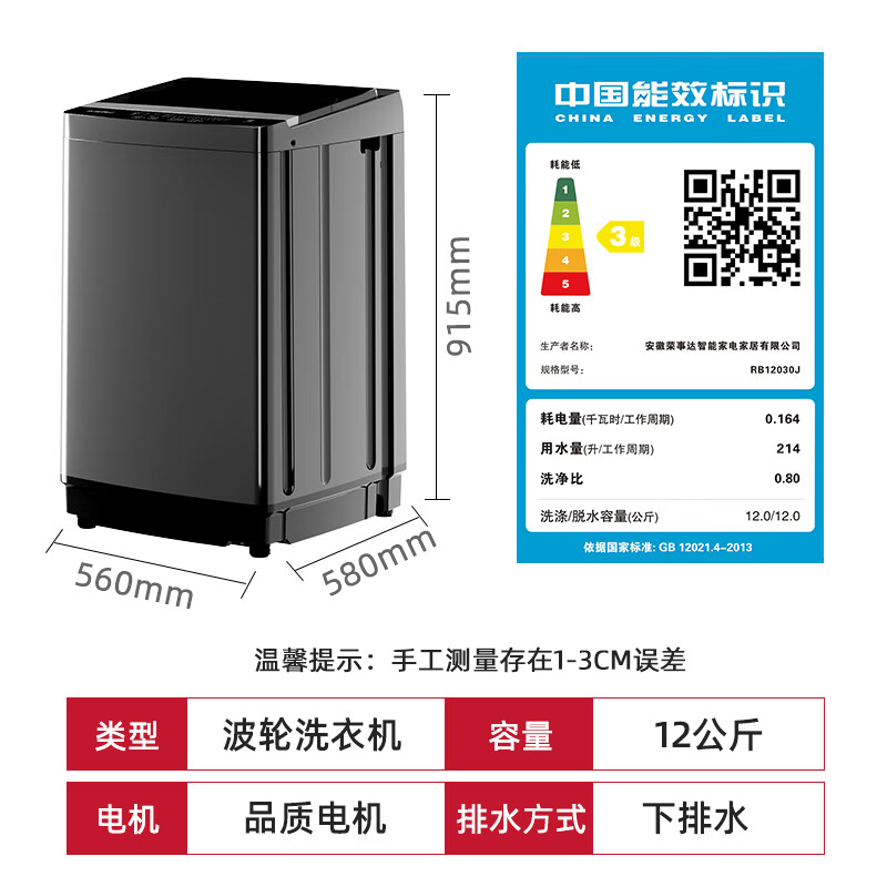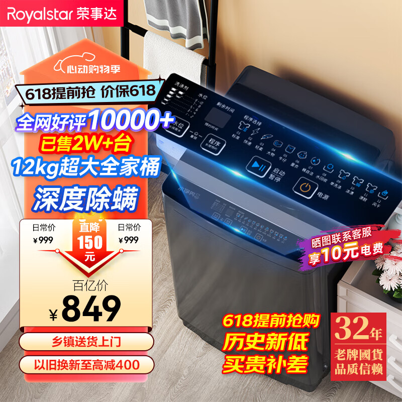 荣事达(Royalstar)洗衣机 12公斤全自动波轮大容量家用脱水机甩干机洗衣机 以旧换新 深灰色 RB12030J价格:849.00元!