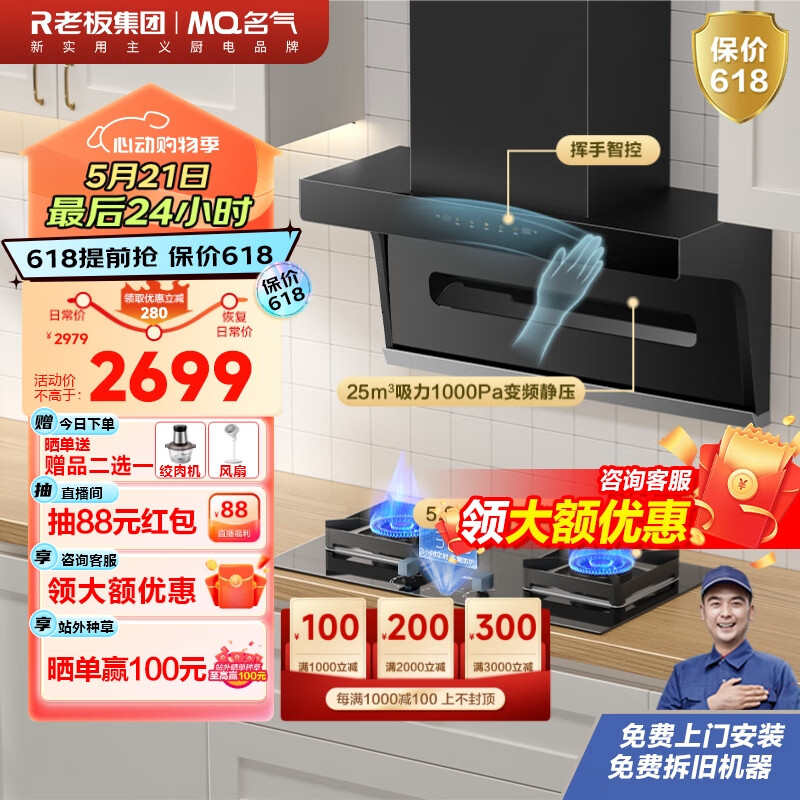 名气(MQ)老板抽油烟机7字型家用顶侧双吸变频油烟机家用24大吸力1000Pa变频烟灶套装双天然气A5508+A6820B价格:2979.00元!