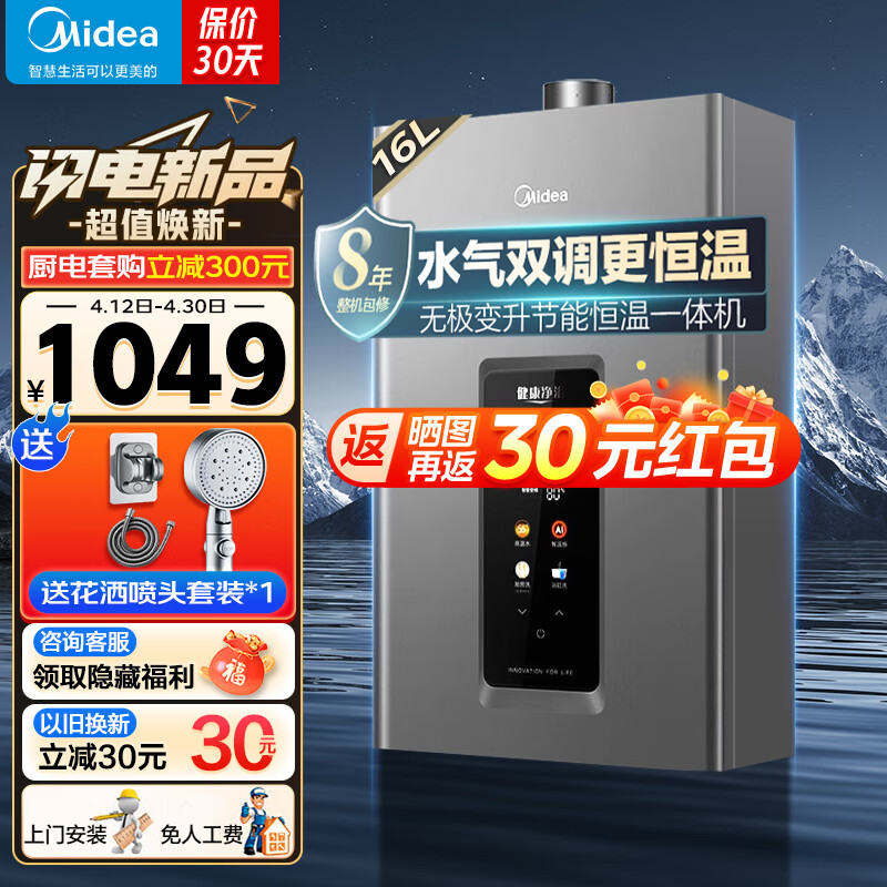 美的(Midea)燃气热水器天然气温感水伺服变频节能五重过滤净化水质WIFI智控家用强排式智能恒温JSQ30-KS2价格:1049.00元!