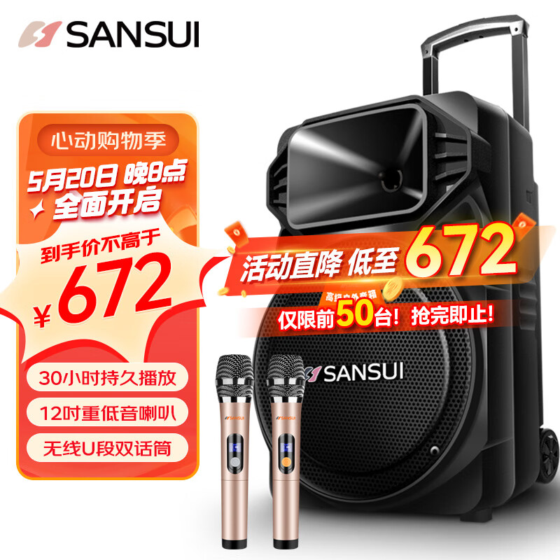 山水(SANSUI)广场舞音响音箱专业设备 户外k歌专用拉杆音响 移动便携式蓝牙播放器 大功率 双话筒 SS6-12价格:672.00元!