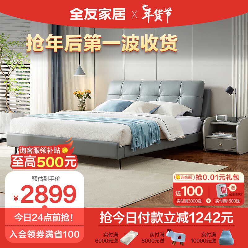 全友家居 皮艺双人床1.5米 轻奢主卧室家具头层牛皮婚床105135B价格:4141.43元!