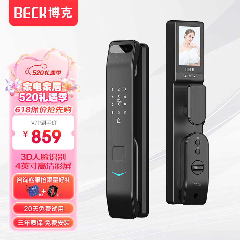 BECK博克指纹锁密码锁智能门锁电子锁全自动智能锁人脸识别大屏猫眼V7P价格:1399.00元!