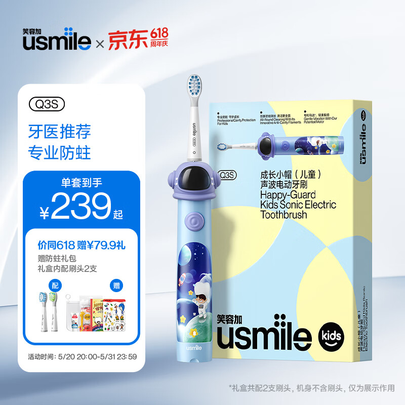 usmile笑容加 儿童电动牙刷 声波震动 专业防蛀 成长小帽刷 蓝 适用3-12岁 儿童礼物价格:300.00元!