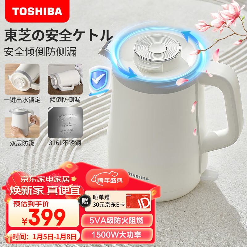 东芝(TOSHIBA)水物语倾倒防侧漏水壶防烫烧水壶电热水壶316L不锈钢1.5升大容量开水壶KT-15DRSC(W)价格:399.00元!