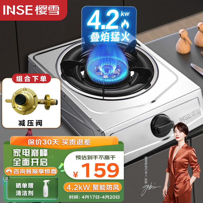樱雪(INSE)燃气灶单灶 台式不锈钢面板4.2kW火力煤气灶单灶节能单眼灶 JZY-T1501(G)W液化气+减压阀价格:159.00元!