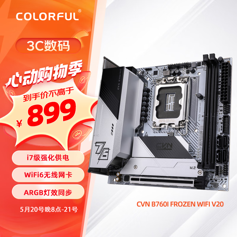 七彩虹(Colorful)CVN B760I FROZEN WIFI V20 DDR4主板 支持CPU 13400F/13700F (Intel B760/LGA 1700)价格:899.00元!