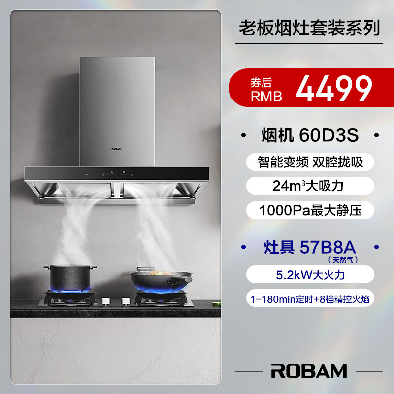 老板(Robam)抽油烟机D3S欧式顶吸双腔变频24大风是家用燃气灶吸油烟机灶具装60D3S+57B8A(天然气)价格:5099.00元!