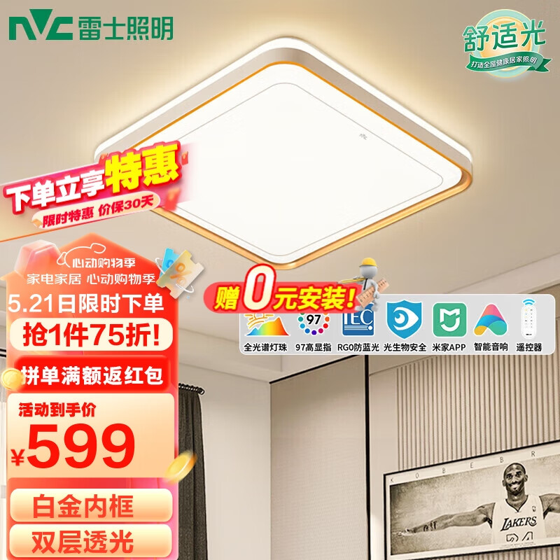 雷士(NVC)LED吸顶灯现代简约卧室书房餐厅灯具AI智控大尺寸RA95方灯灯饰价格:798.00元!
