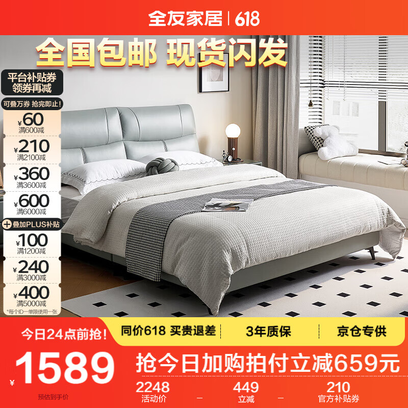 全友家居 真皮艺床现代轻奢主卧室头层牛皮双人大床1.8x2米家具105201价格:2248.75元!