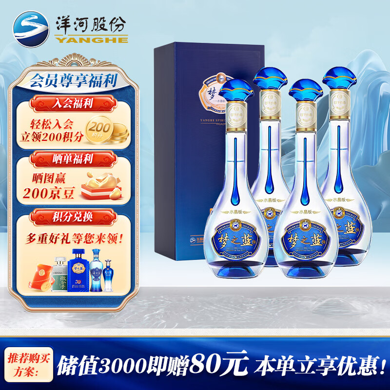 洋河 梦之蓝M3水晶版 52度 550ml*4瓶 整箱装 绵柔浓香型白酒价格:2808.00元!