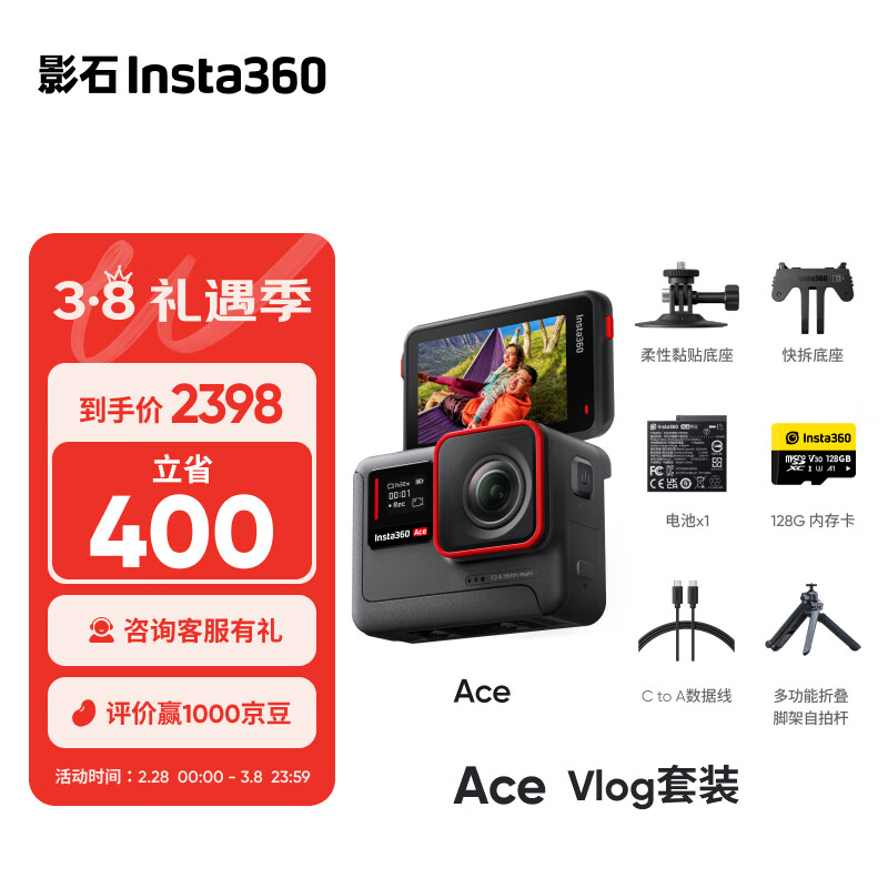 Insta360影石 Ace 旗舰影像AI运动相机 防抖摩托车骑行潜水Vlog摄像机(Vlog套装)价格:2398.00元!
