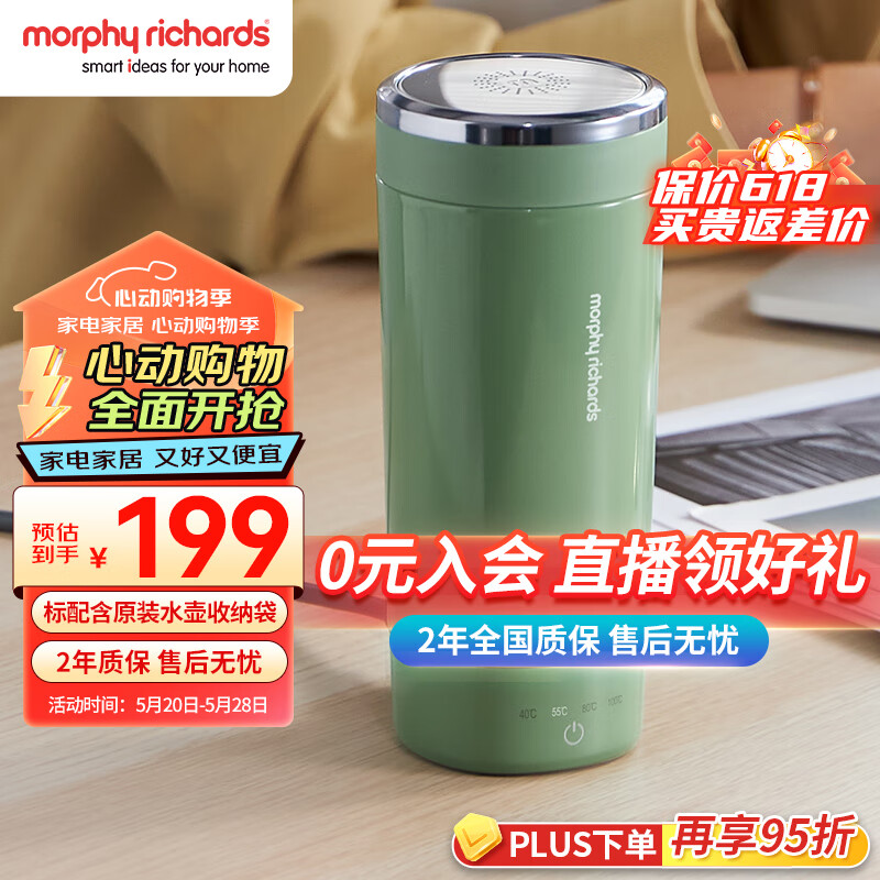 摩飞电器(Morphyrichards)电水壶 烧水壶便携式家用旅行电热水壶 随行冲奶泡茶办公室养生保温杯MR6060绿价格:199.00元!