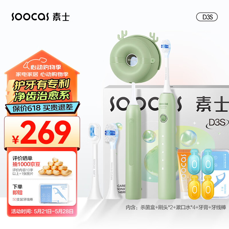 素士 SOOCAS 声波电动牙刷成人 亮白去渍杀菌猫爪刷礼盒 免打孔 情侣款 D3S绿 送女友520情人节礼物价格:292.40元!