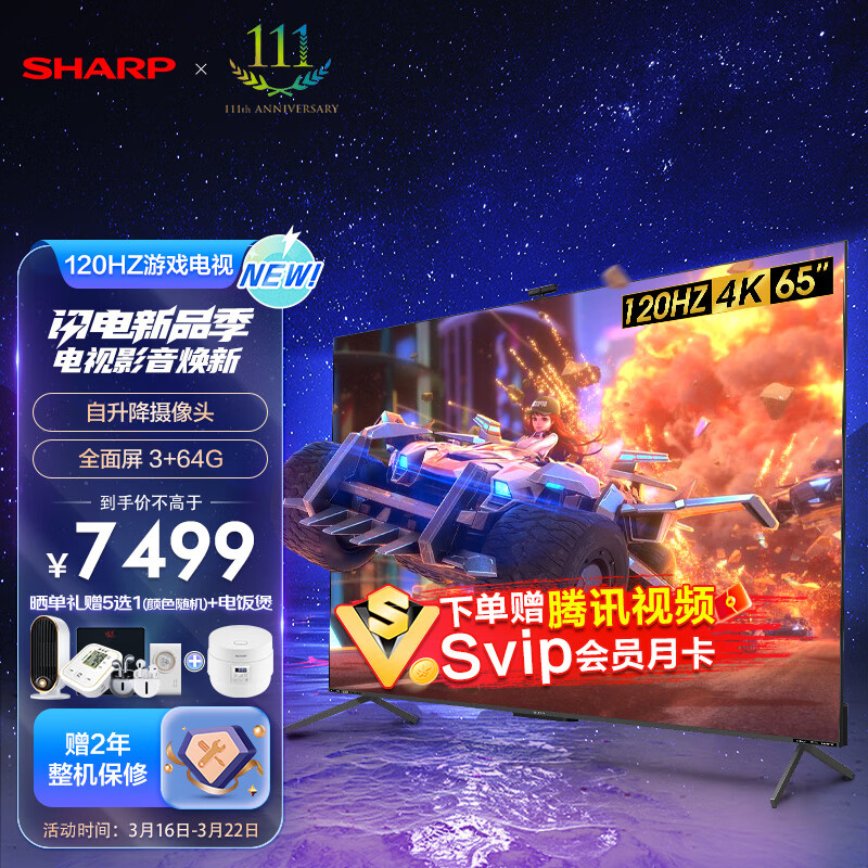 SHARP夏普电视4T-C65V7EA 65英寸120HZ液晶彩电4K屏3+64G游戏电视AI智能摄像头远近场语音平板电视价格:7299.00元!