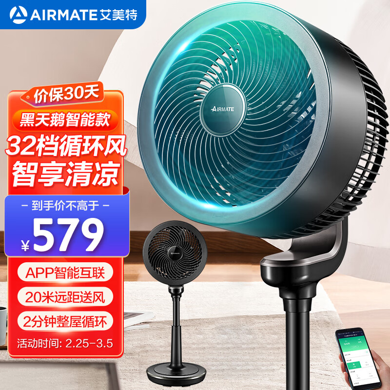 艾美特(AIRMATE)“黑天鹅智能款”空气循环扇APP智能操控32档直流变频家用落地扇3D自动摆头四季适用电风扇 AD18价格:629.00元!
