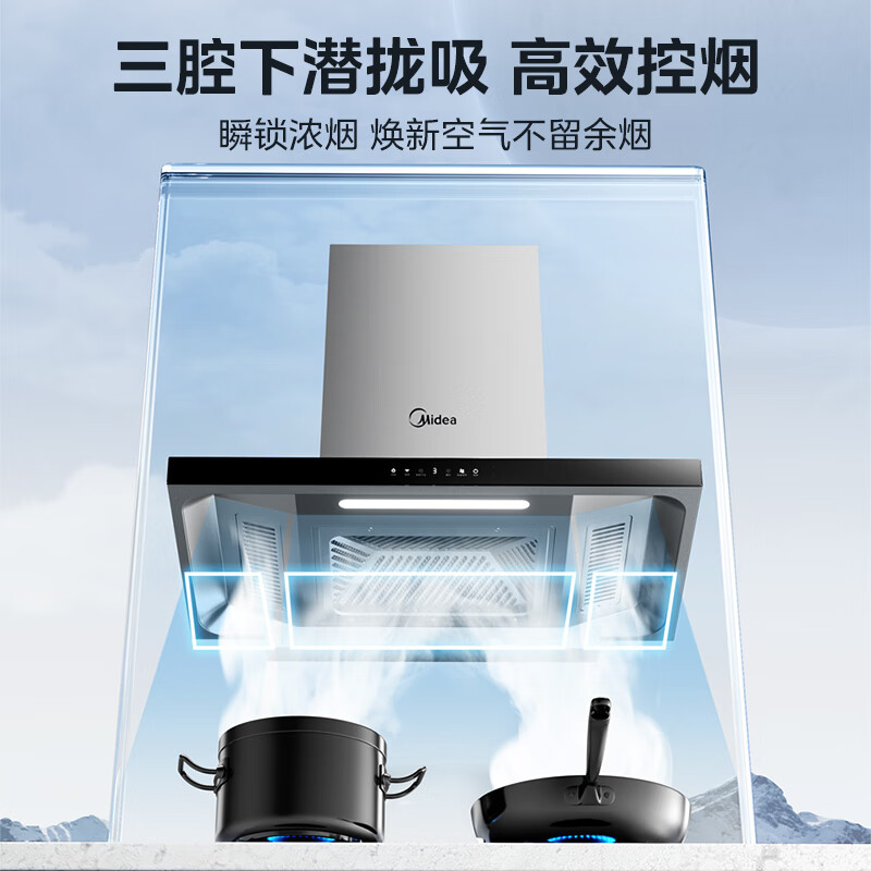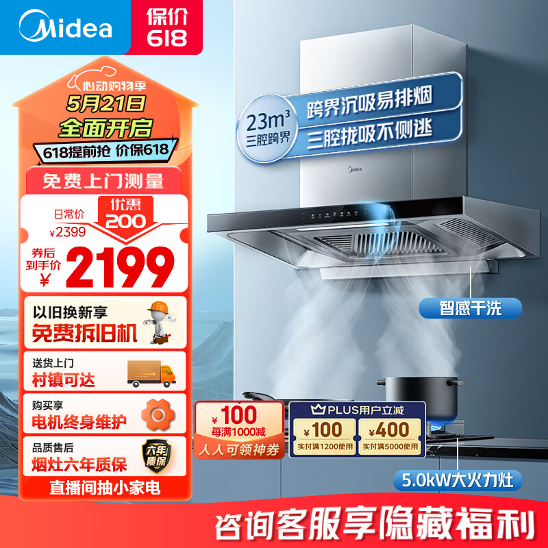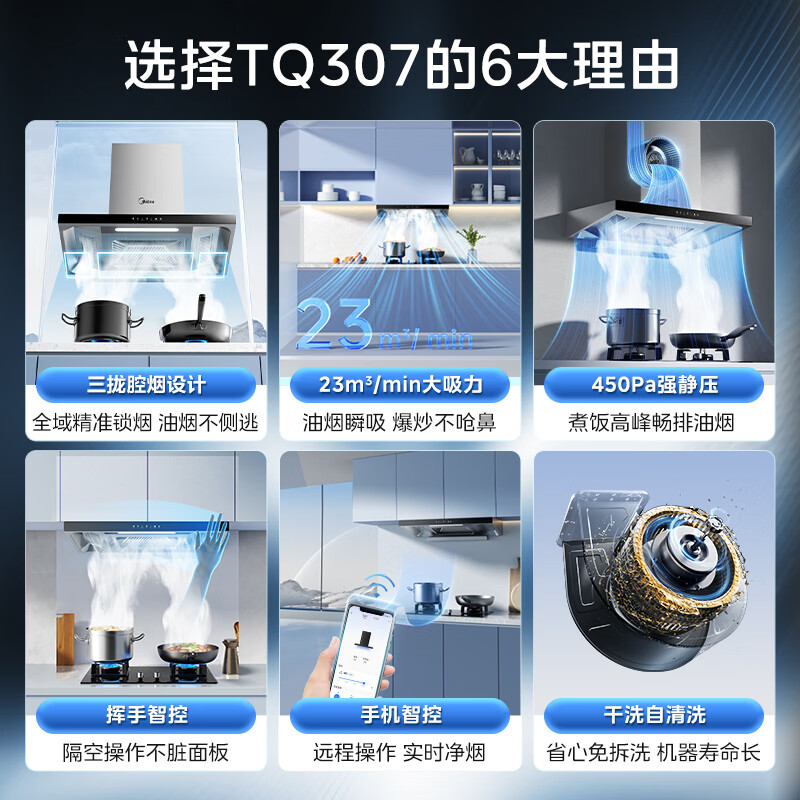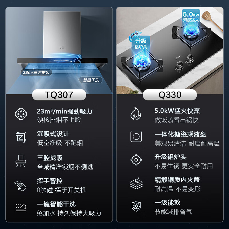 美的(Midea)抽油烟机燃气灶具套装23风量欧式顶吸 三腔家用吸油烟机自动清洗烟灶套装TQ307+Q330天然气价格:2399.00元!