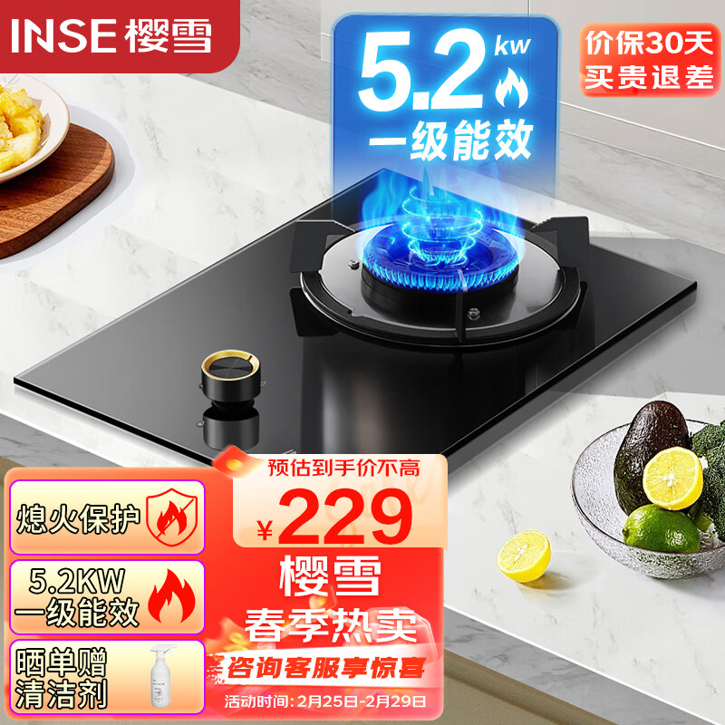樱雪(INSE)灶具燃气灶煤气灶单灶 5.2kW猛火灶 台式嵌入式大火力灶台 家用节能单眼灶JZT-Q2426(天然气)价格:229.00元!