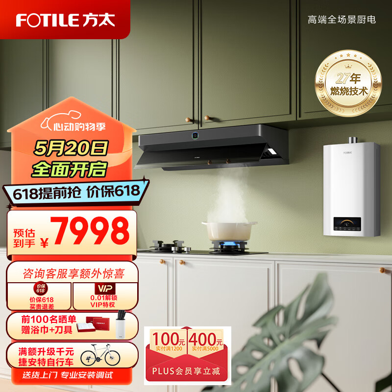 方太(FOTILE)家用厨房烟灶热三件套 24风量顶侧一体变频烟机 5kW联动燃气灶 16升热水器F2.I+THF1-G+S16D1价格:8798.00元!