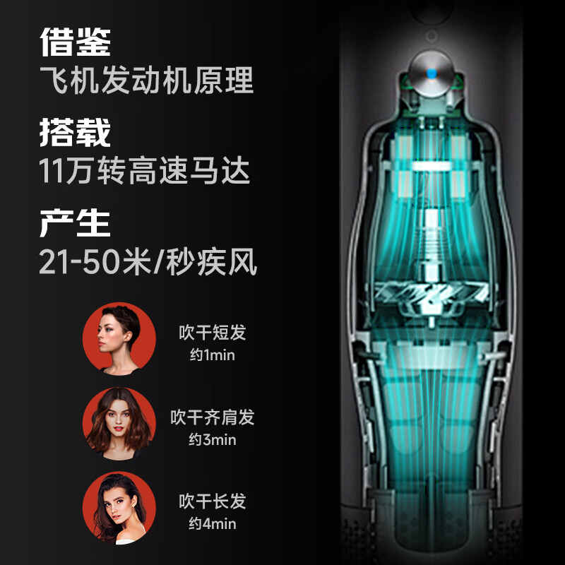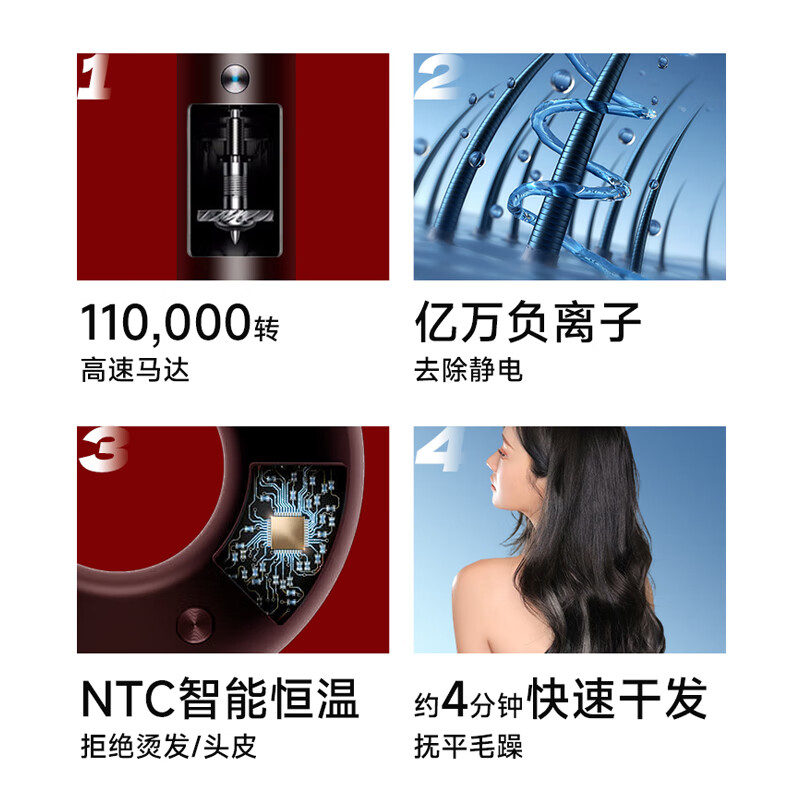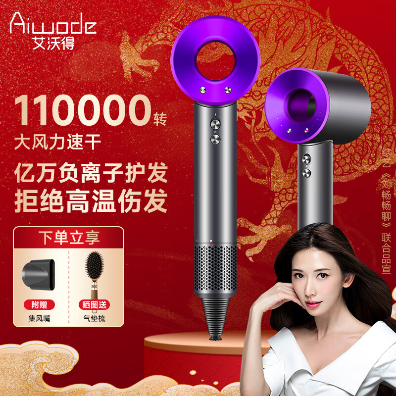 艾沃得高速无叶吹风机家用负离子大功率不伤发德国大风力风筒发廊电吹风速干低噪音便携护发养发恒温 亮紫色(单风嘴)价格:199.00元!