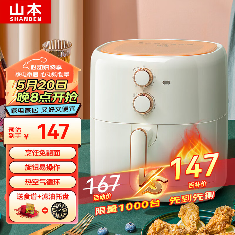 山本(SHANBEN)空气炸锅 家用多功能4.2L大容量 无油烟多功能电炸锅大功率 无油低脂煎炸锅易清洗价格:147.00元!
