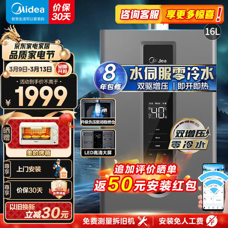 美的(Midea)零冷水燃气热水器双增压循环泵家用厨房强排变频恒温省气智能家电JSQ30-NT1 Pro 16L天然气价格:1999.00元!