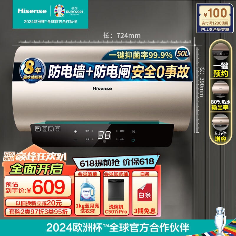 海信(Hisense)50升家用电热水器2100W速热5.5倍增容大屏触控自清洁智能预约双重防电保护DC50-W1513T以旧换新价格:608.00元!