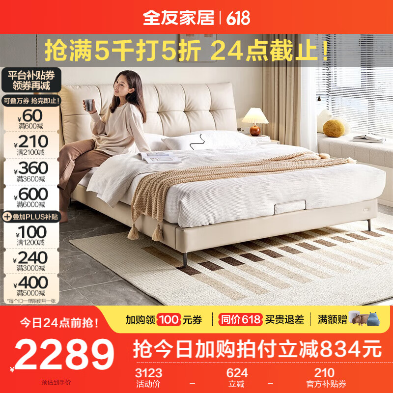 全友家居 奶油风真皮云朵床1.5x2米主卧室家具软包高脚双人床116026价格:3123.75元!