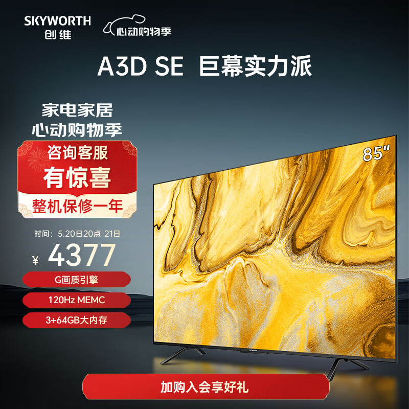 创维电视85A3D SE85英寸电视机G画质引擎3+64G 120Hz MEMC远场语音护眼平板液晶巨幕大屏价格:4477.00元!
